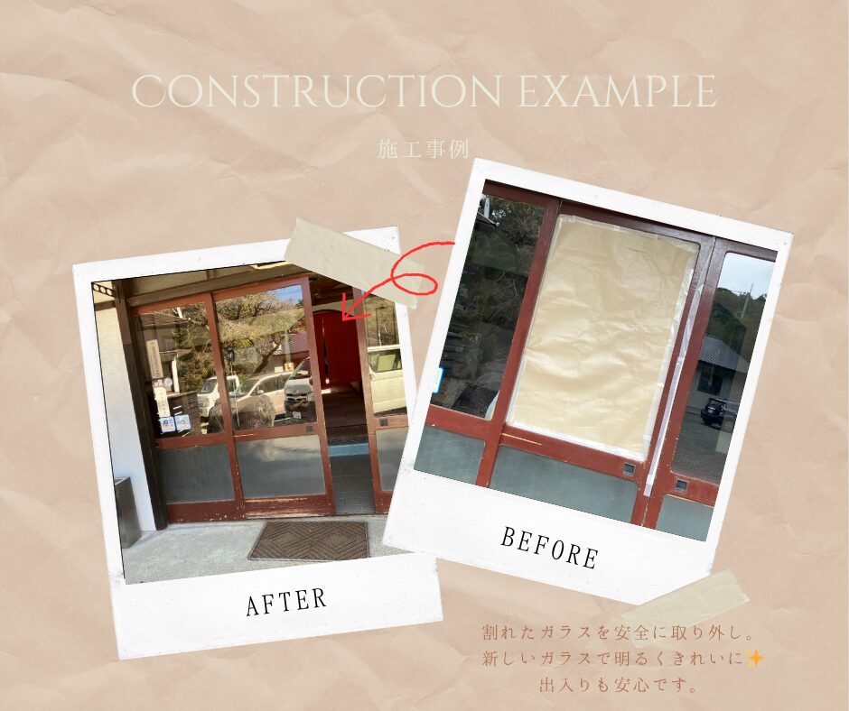 市内の民宿にて、玄関の木製引違い戸のガラス修繕を行いました。