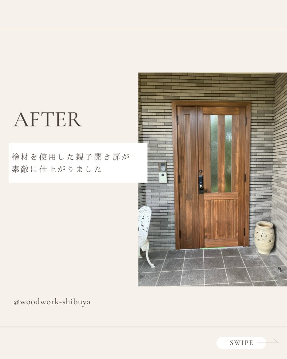 檜材を使用した親子開き扉で、温もりと高級感を兼ね備えた美しい玄関が完成しました✨