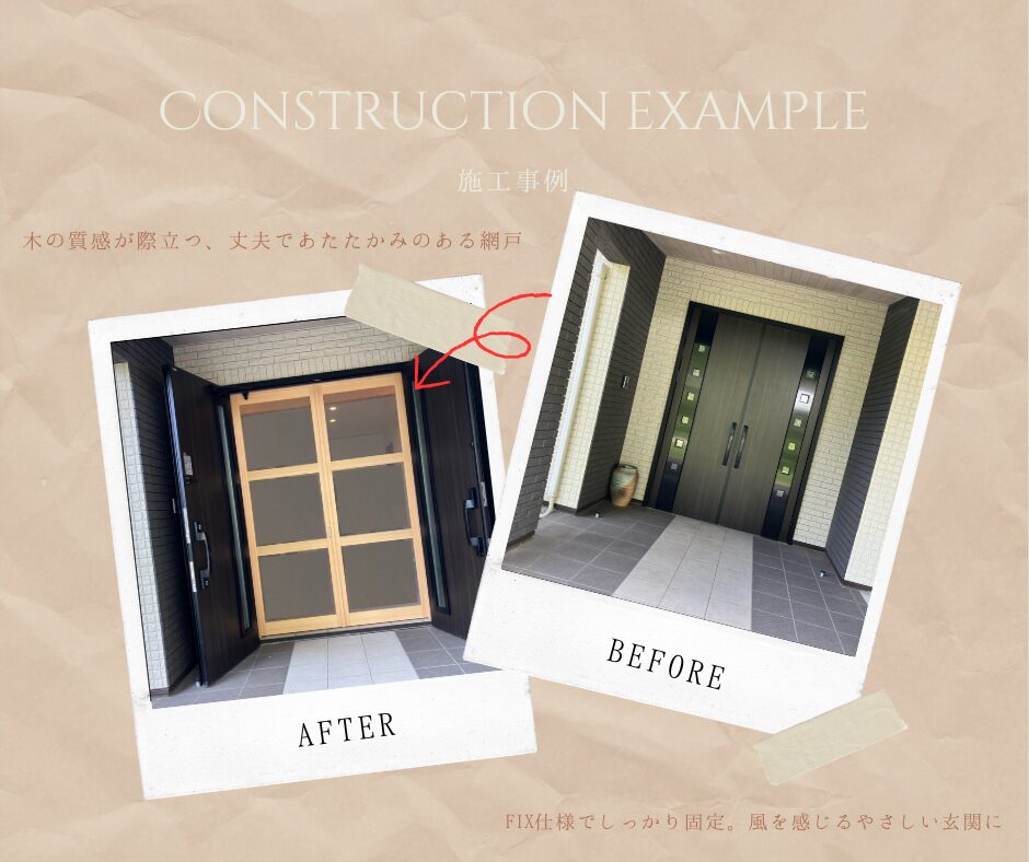#渋谷木工所 #施工事例 #木製網戸 #玄関リフォーム #ヒバ材 #職人の手仕事 #FIX仕様 #通風ドア代替 #ペット対応 #町内施工 #木のある暮らし